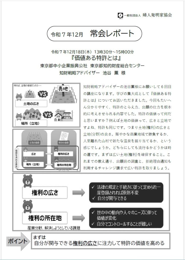 常会について 当協会では1ヶ月に1回、常会という名前の勉強会を開いています。知的財産に関する勉強会、特許出願書の書き方、プロカメラマンによる商品写真の撮り方、グラフィックデザイナーによるチラシの作り方、企業とのマッチング、親睦をかねた工場見学や産業技術の体験会などを企画しております。日程やお申込み方法は、ホームページの更新情報でお伝えしています。Zoomでの開催が多いので、遠方の方もご自宅からご参加いただけます。見学会では、親睦もかねたランチ会を行います。ぜひご活用ください。 常会参加お申込み お名前 (必須) メールアドレス (必須) 電話番号 参加人数(お2人以上の場合) メッセージがあればどうぞ 常会レポート